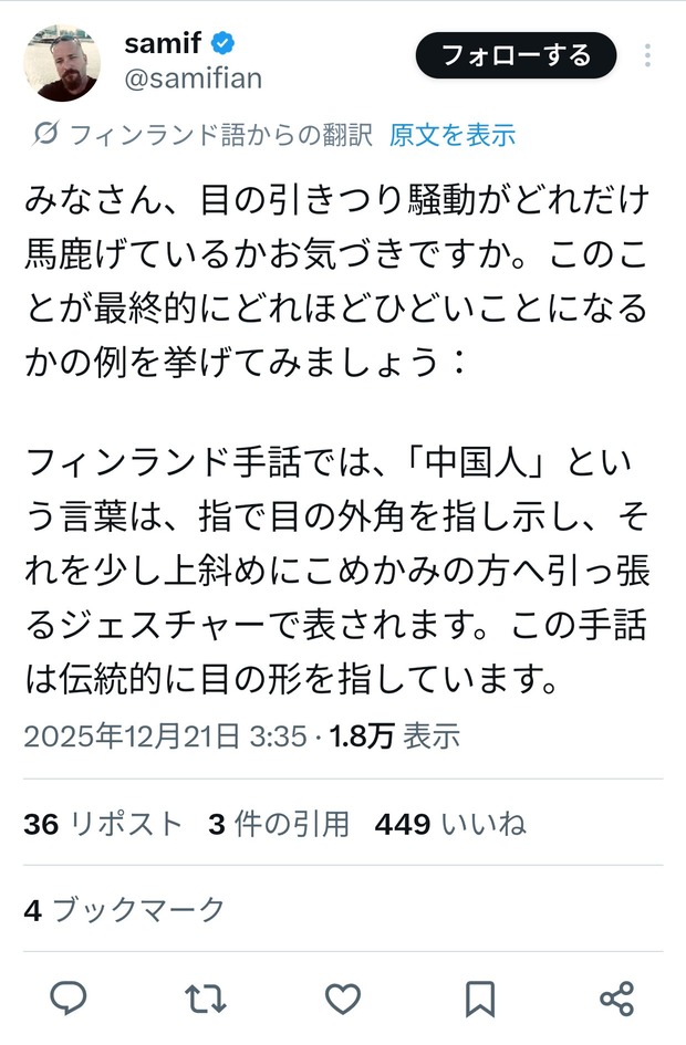 【悲報】フィンランド人「本当に馬鹿げている、フィンランドの手話ではあのつり目ジェスチャーが中国人を指すものです」