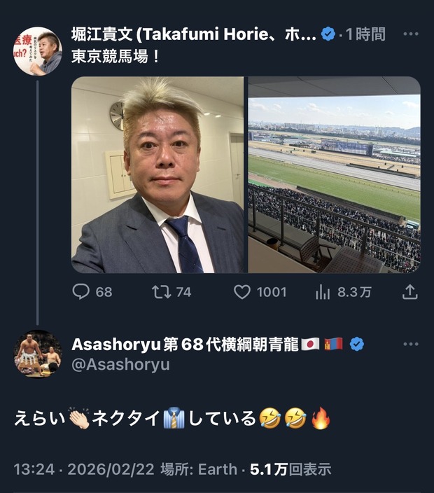 1 : 以下、?ちゃんねるからVIPがお送りします :2026/02/22(日) 15:42:04.105 ID:jImWOrzD0.netまずいですよえらい👏🏻ネクタイ👔している🤣🤣🔥— Asashoryu第68代横綱朝青龍🇯🇵🇲🇳 (@...