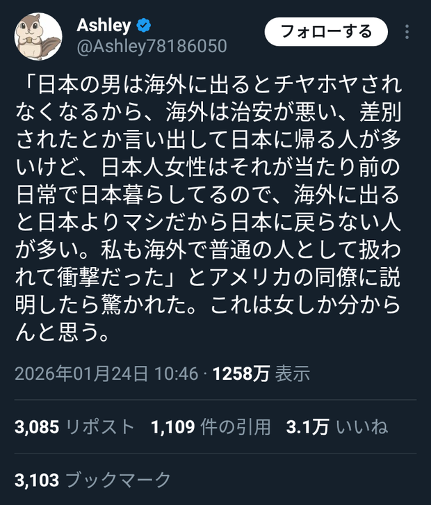 【悲報】X女さん「日本は男尊女卑だから日本人女性は海外に出ると日本に戻らない人が多い」←3万いいね!