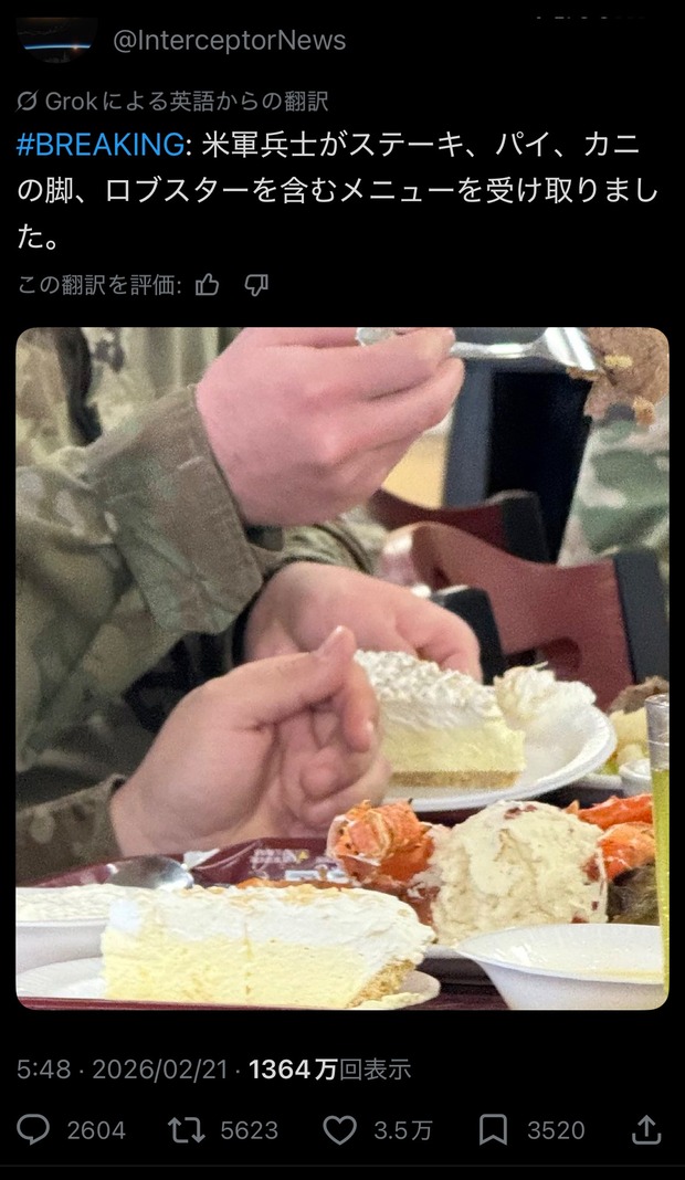 1:2026/02/22(日) 17:51:43.76 ● 2BP(3000).netID:↑リンクが切れていたので↓で代替💥BREAKING:🇺🇸 U.S. Troops received menus including, steak, ...