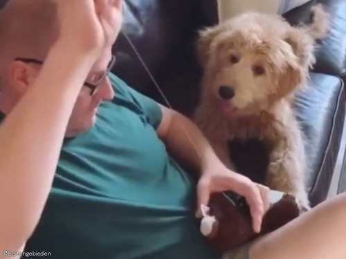 あちこち破れた動物のぬいぐるみを、針と糸で修繕する男性。それを見てソワソワする犬をご覧ください。続きを読む