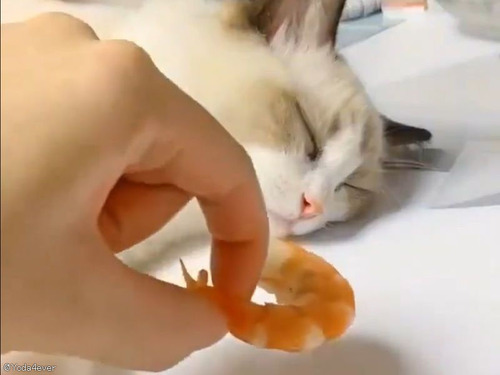 ぐっすり眠る猫の鼻先に大好物のエビを置いてみたら…夢の中でモグモグ