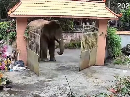 「ドーン!」と門を開けて入ってくる野生のゾウ…民家の庭を一周して立ち去って行く(動画)