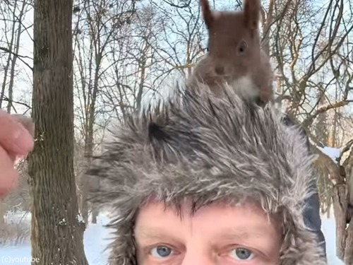 「野生のリスに懐かれた…」頭の上で木の実を与える男性(動画)