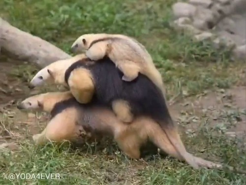 ミナミコアリクイは黒色のベストを着ているような見た目で、家族が仲良しな動物。家族で3段おんぶしている姿が目撃されました。続きを読む