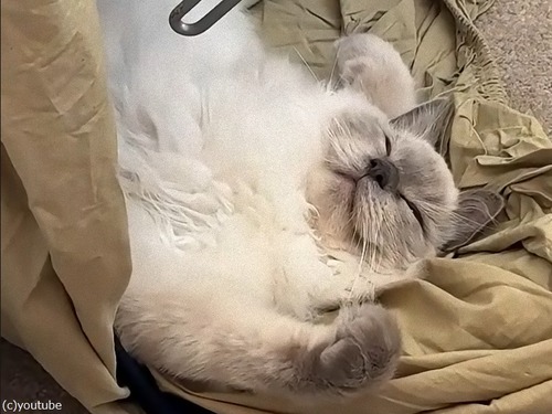 「いったい何が!?」猫が自ら作り出した混乱の中で眠る(動画)