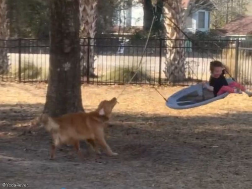 ブランコのような遊具に乗った少女。本来は人間にクルクル回してもらう必要があるのですが……。代わりにゴールデンレトリバーが頑張ってくれる様子をご覧ください。続きを読む