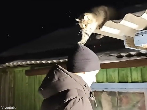 屋根の上で寒そうにしている愛猫を…飼い主が肩に乗せて帰宅する(動画)