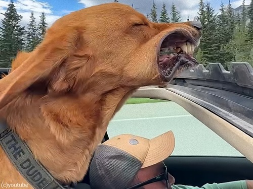 車のサンルーフから顔を出すのが好きな犬が…すごい顔に(動画)
