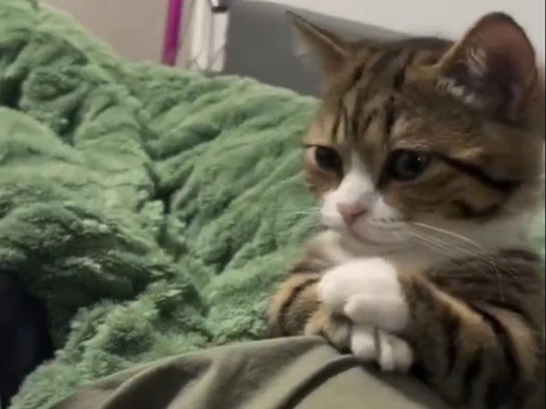 人間のひざの上で、腕を組む子猫。幼いのに老紳士のような姿を、ご覧ください。続きを読む