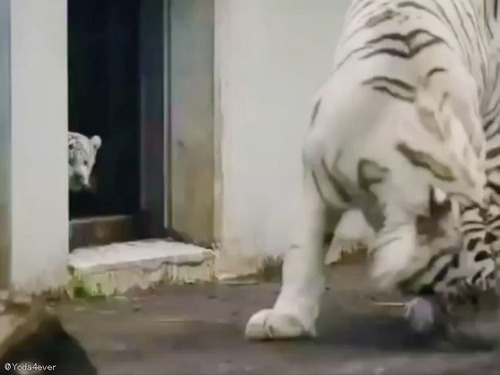 ママ虎を背後から驚かせようと、ドアの陰に隠れてチャンスをうかがう赤ちゃん虎。思った以上に成功した、その様子をご覧ください。続きを読む