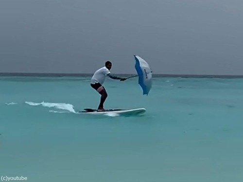 「風が強い日、傘を帆にしてウィンドサーフィンを試したら…本当にできた!」(動画)