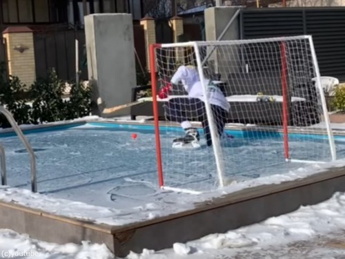 凍った庭のプールでアイスホッケーをしたら…予想通りの悲劇が起きる(動画)