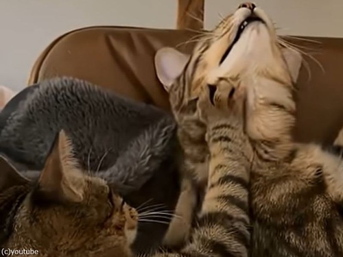 猫が猫の首筋をもみもみ…気持ちよすぎてゴロゴロが止まらない(動画)