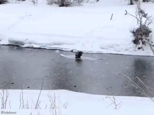 「まるでサーフィン?」極寒の川でビーバーが省エネ移動