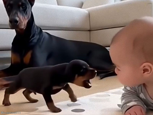 犬の赤ちゃんが人間の赤ちゃんを吠えていたら…ママ犬の優しい行動