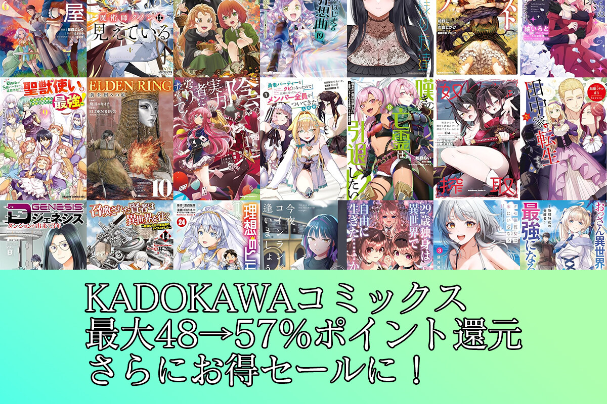 KindleでKADOKAWAコミックス新刊含めたポイント還元セールが開催中ですが、1月1日よりポイント還元率が上がり、47~48%だったところが56~57%ポイント還元となりました!実質半額以上のセールとなります。こちらでは、改めて対象作...